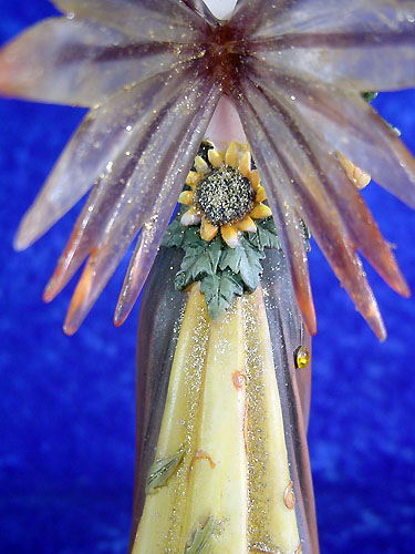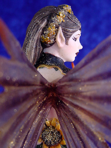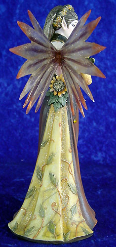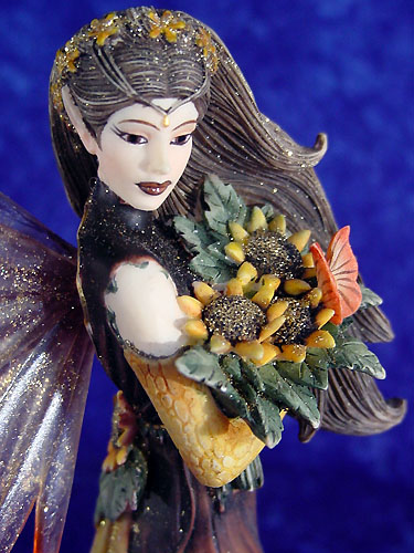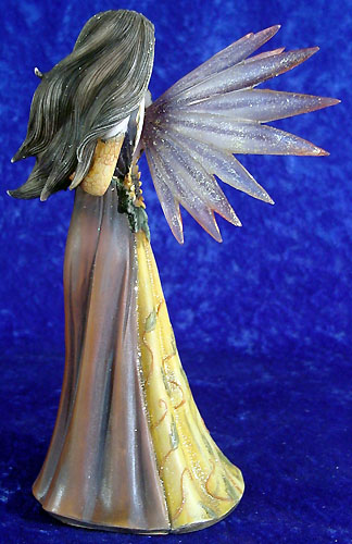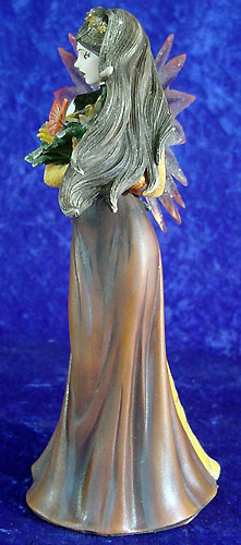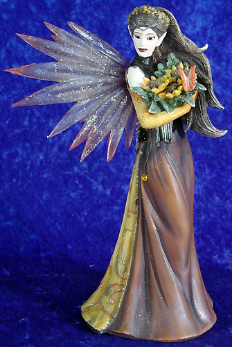 One of four "Seasonal Faerys" These were created by Jessica for Dragonsite instead of the usual way of Dragonsite buying the rights to use a piece of existing art! Jessica's idea was "captured magic" which she thought of back in 2004 and she created a piece of 3D art which comprised of a Faery based on her art in a large glass dome stood on a wooden base, the faery would then be surrounded by silk foliage and silk butterflies. the first one was a one off piece called "Winter Fantasia" which was sold on eBay for $350.00 in December 2004. Talks with Munro (Dragonsite) were started to make them affordable and resulted in the four seasonal faerys, but the domes and silk extras vanished and just the figures made it to production. |