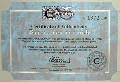 The Ice Demon was made to fit together with EN2237 Barbarian and the first 750 were sold as EN2244 The Battle for the Orb and was supplied with a small 'plug' to fit between them as shown in the picture below and they came with a single certificate