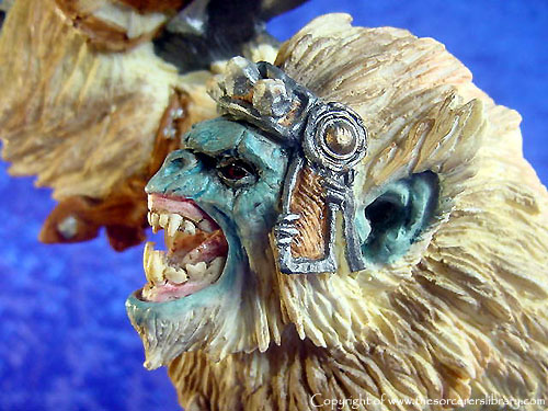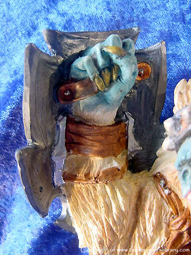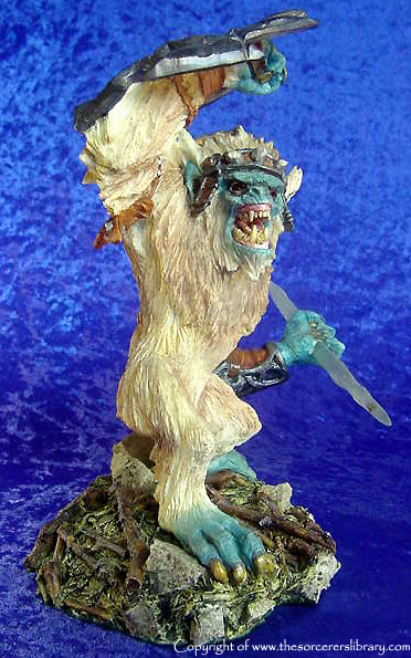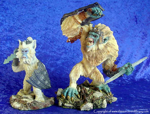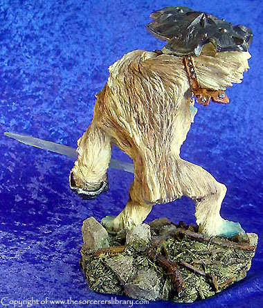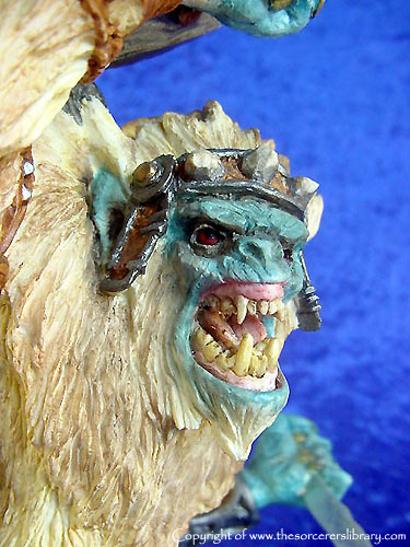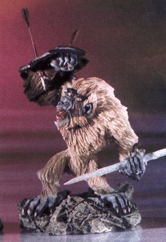 Made to go with EN2237 'Barbarian' Also first 750 sold as Set as EN2244 'Battle for the Orb' with a small piece to join them together The Ice Demon was first shown with arrows stuck in the shield but they were removed for production, two original samples with the arrows and a white resin spear were sold at the 1999 Extravaganza auction for £430 and £455. I had the chance to buy one of these in 2000 but the owner sold it to someone else less than 24 hours after I told him I would buy it from him, so be warned some people will sell to others before you have a chance to write a cheque. If anyone knows who has one of these pieces please let me know as I would love a photo of one of them (See photo at bottom of page) |
