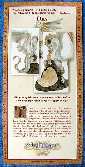 This fabulous beast has a hoard of diamonds, and shards of gold glimmer along his brilliant span as he makes his dazzling journey across the sky, banishing the shadows of Night to the caves and crevices. The verbu Magus reads "with the coming of Day the shy and the ugly retreat to their pockets of darkness, and the bold and the beautiful bathe in the glorious light." He closes the book with a wry smile.