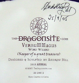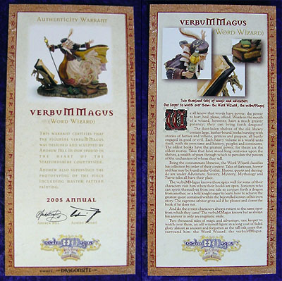 This is the Verbum Magus himself, the one who gives his name to the entire range. It was intended to be a limited piece of 2000 but a decision was made to make him the annual piece for 2005 *Even though it is the annual piece it didn't make it for release until July Just one slight dissapointment for me was the loss of the glasses that were seen on the wax master, I thought that they added even more character to the wizards face.