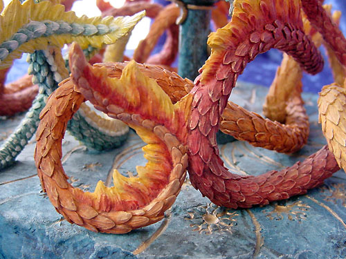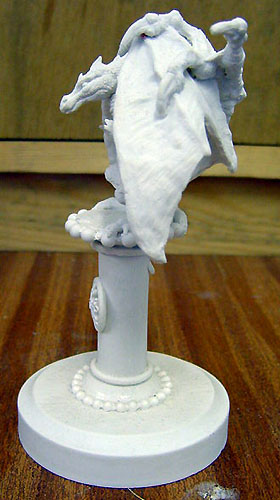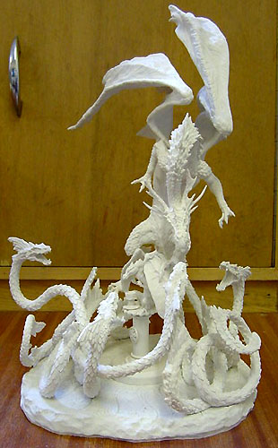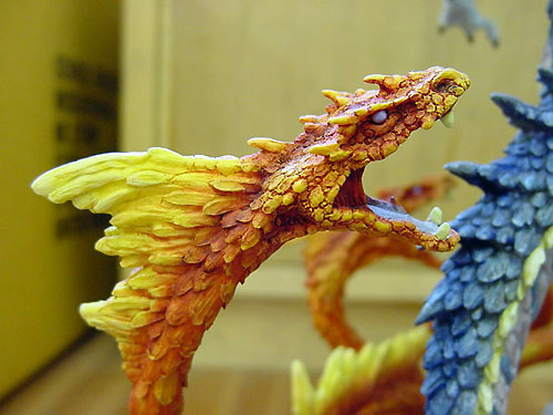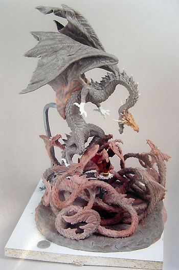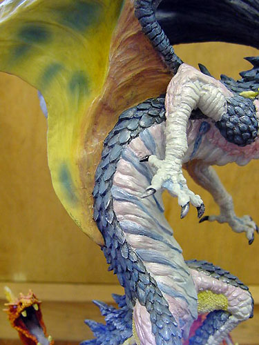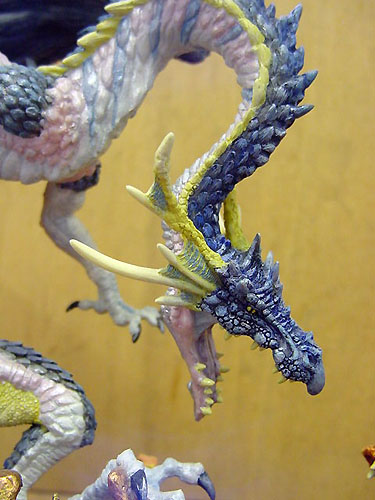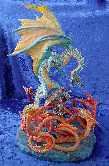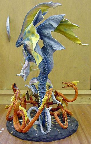 Here are photos of a paint trial version in May 2002, It's similar to the one at the show in September 2005 but with some differences. This paint trial has horrible blue blotches on the wings which have gone, there is now yellow on the underside and the ridge spines on the back and on the scales on the face, plus the serpents on the base are now shaded slightly different colours instead of like this version which are all the same, and finally, the dark grey base will now be blue.