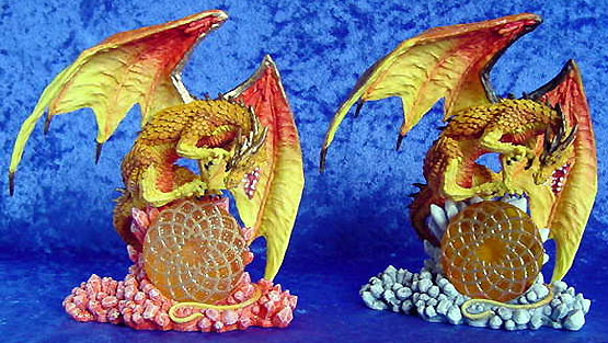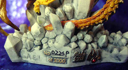 This is one of a set of three pieces (Moonstruck & Starlight being the other 2) that can be bought as a set or as separate figures, for the first 30 days that the pieces were on sale, you could get the sets that have matching Numbers but it cost you more for the privilege It was first released in November 2002 when Andrew Bill did a tour of America and 112 sets were painted for the tour to be sold at the events, Andrew also painted a set at each show (12 sets in all) in a colour of his choice. The tour and production pieces are cast in white resin except for the 'Sun' logo which is in translucent orange resin - Andrew Bill painted a few pieces while on his 2002 tour of the U.S which were completely cast in translucent orange. Production pieces went on sale on the 1st of February 2003 with slightly different paintwork to the tour pieces |