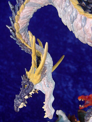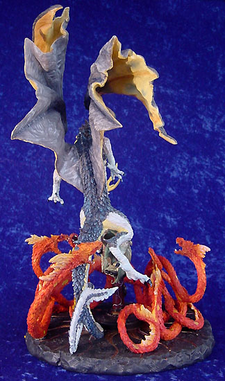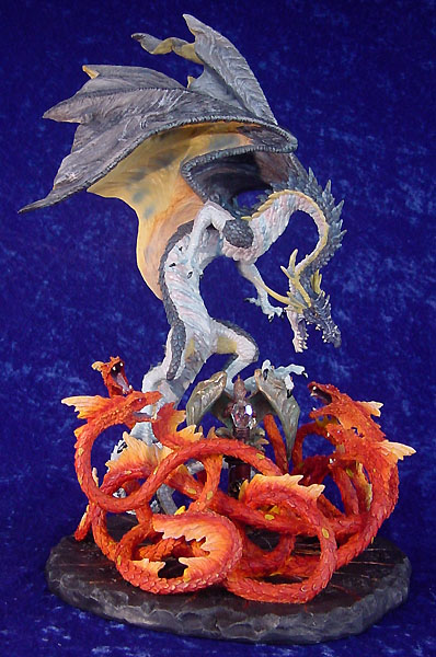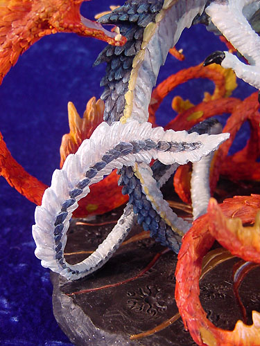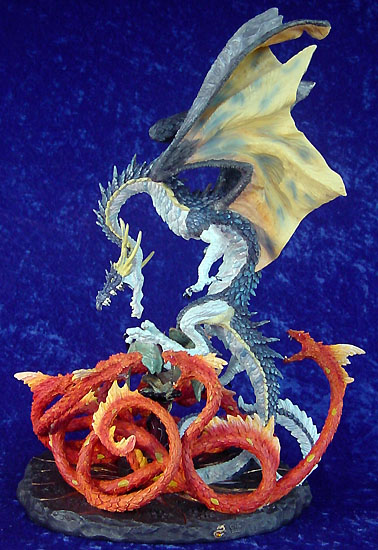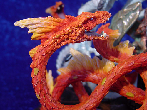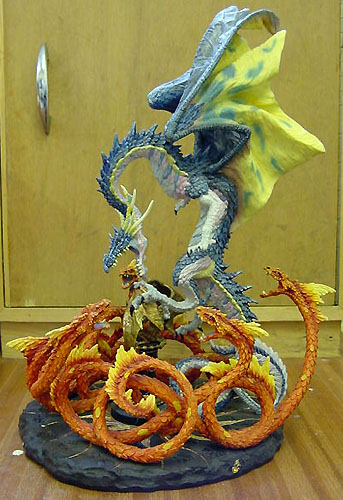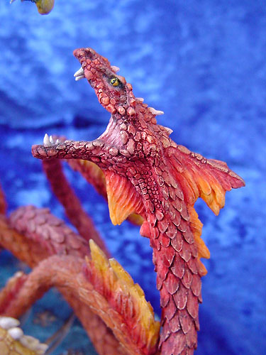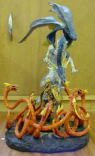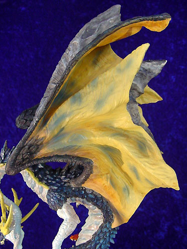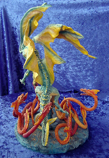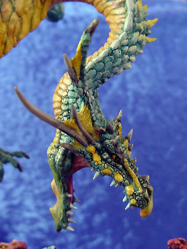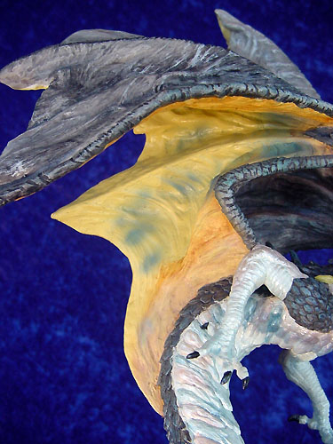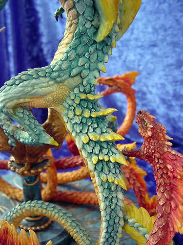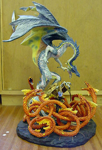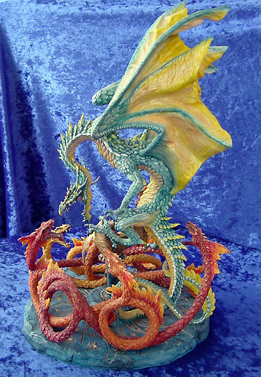 Here are photos of a paint trial version in May 2002, It's similar to the one at the show in September 2005 but with some differences. This paint trial has horrible blue blotches on the wings which have gone, there is now yellow on the underside and the ridge spines on the back and on the scales on the face, plus the serpents on the base are now shaded slightly different colours instead of like this version which are all the same, and finally, the dark grey base will now be blue.