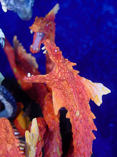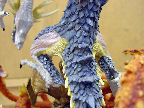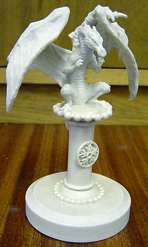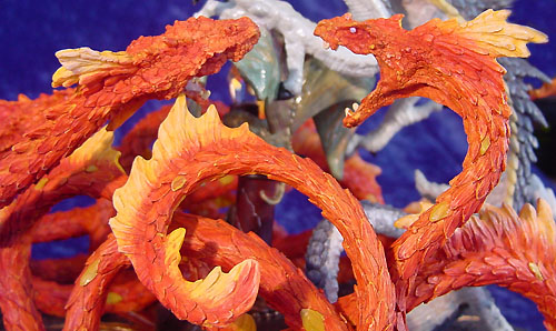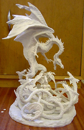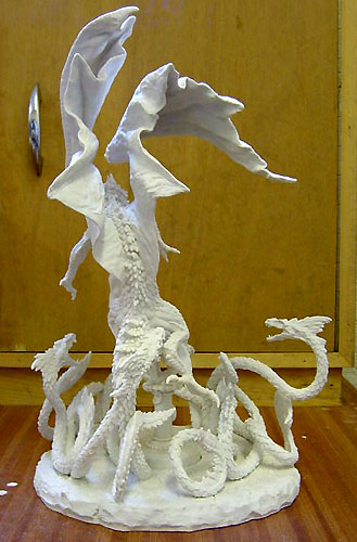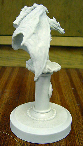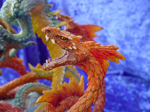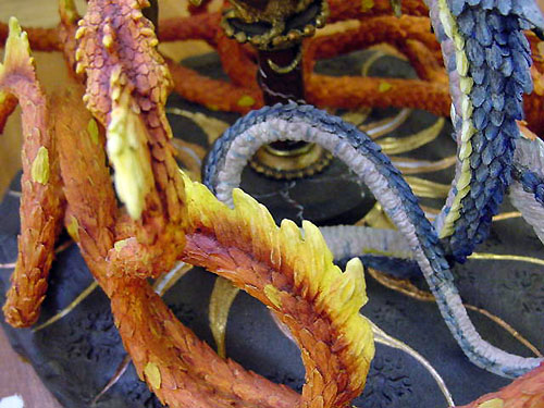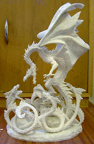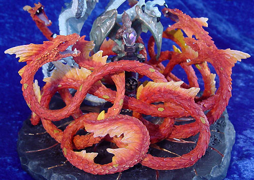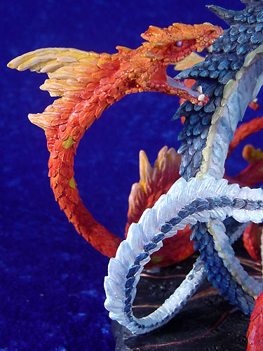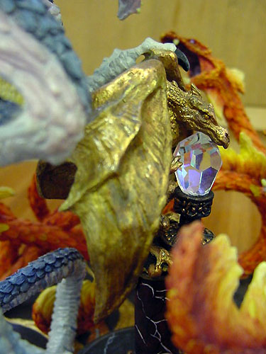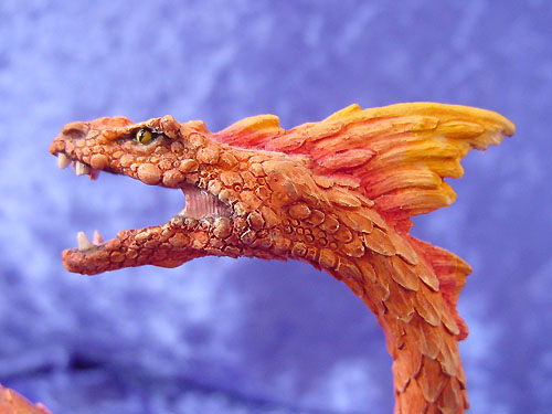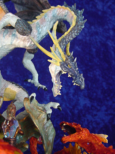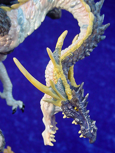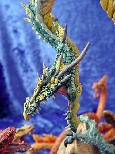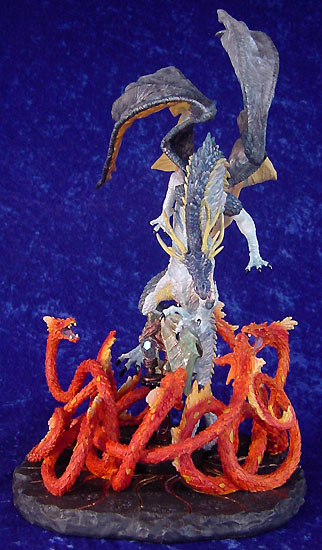 Here are photos of a paint trial version in May 2002, It's similar to the one at the show in September 2005 but with some differences. This paint trial has horrible blue blotches on the wings which have gone, there is now yellow on the underside and the ridge spines on the back and on the scales on the face, plus the serpents on the base are now shaded slightly different colours instead of like this version which are all the same, and finally, the dark grey base will now be blue.