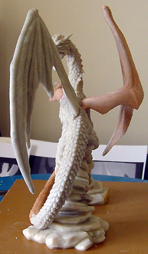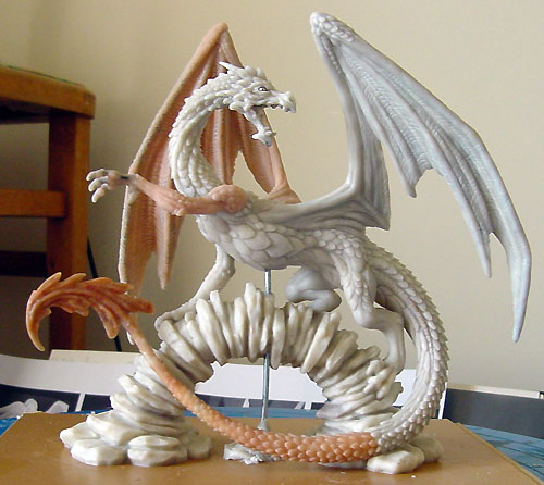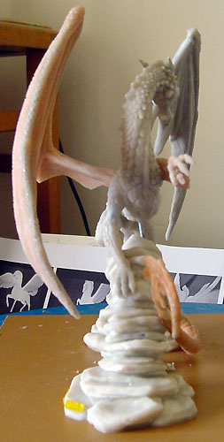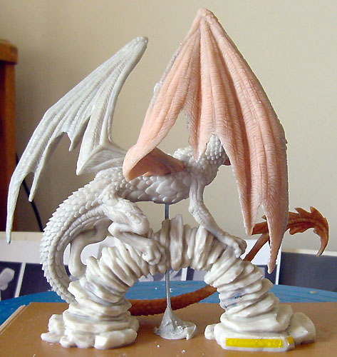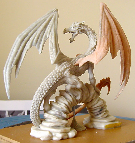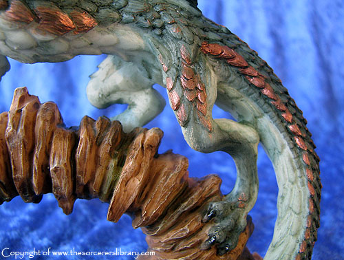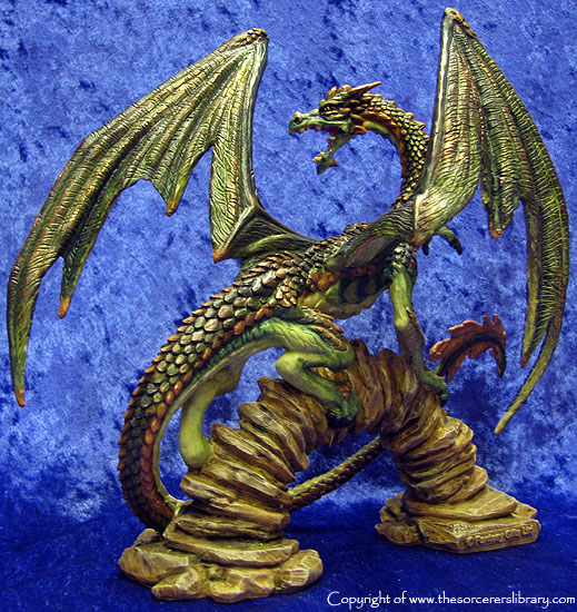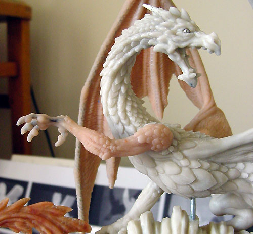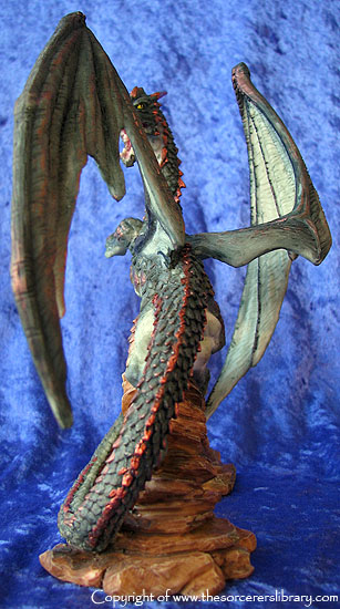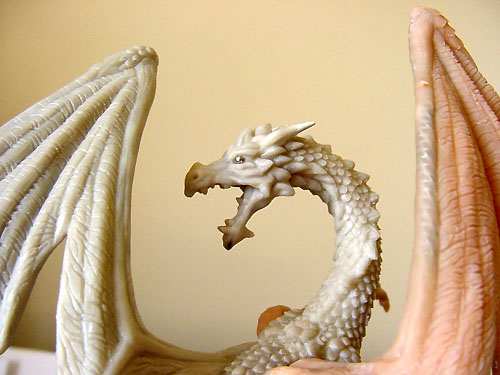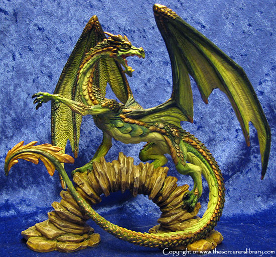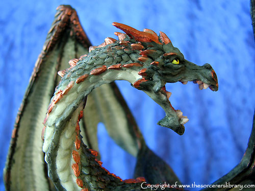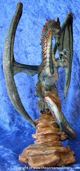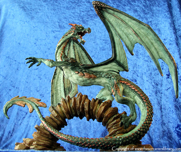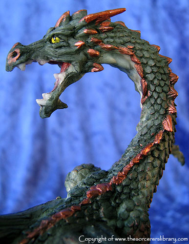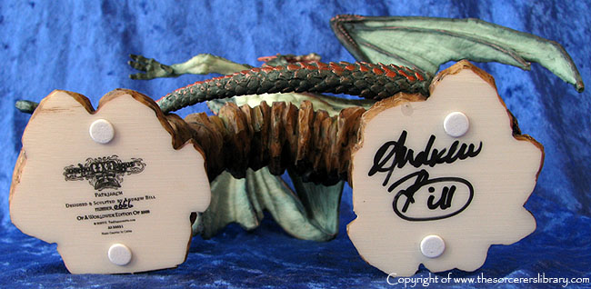 The photos below are of the original paint trial by Tina Sherratt, it was decided that the green was too "young & vibrant" for a dragon named Patriarch, so it was toned down for production. (please note that the photos are a little more yellowy than they should be because of the lighting they were took in)