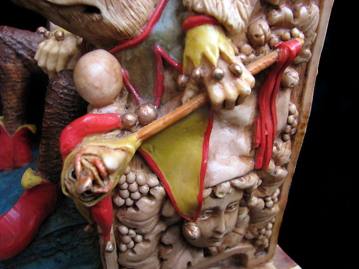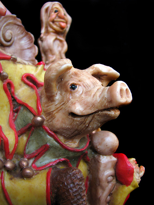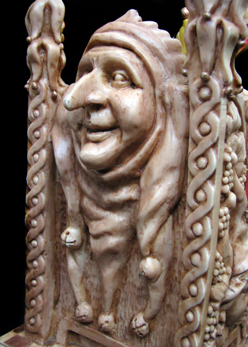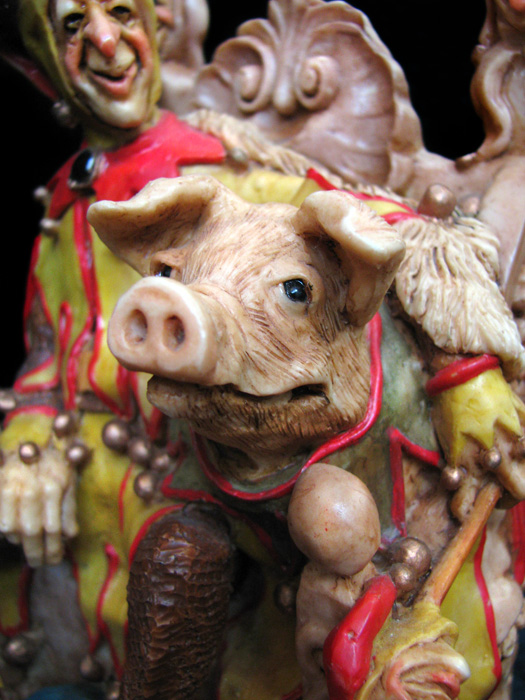 Food was wildly consumed and wine flowed freely as the competition intensified for the coveted title. Baldrick has attained the lofty position and is newly crowned the "King of Merriment and Mischief". With his constant companion, Brunhilde the sow by his side, taking the place of comic queen, he proudly occupies the throne as he rules over his Jester subjects.