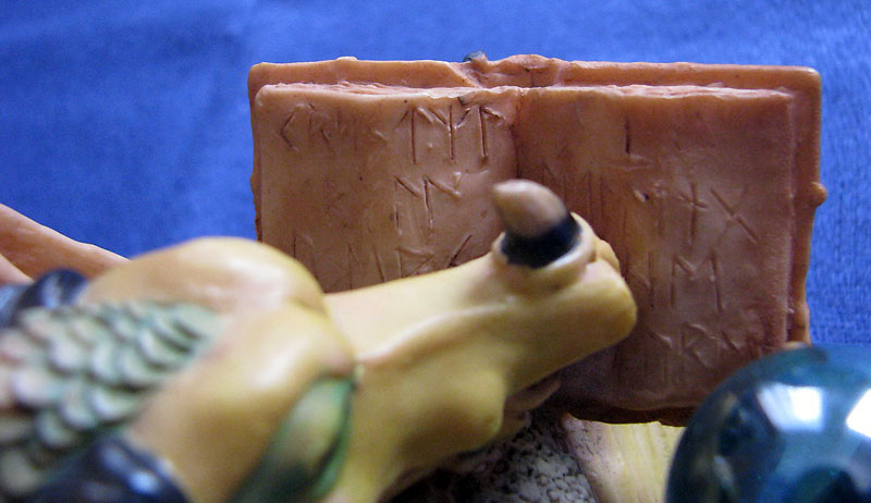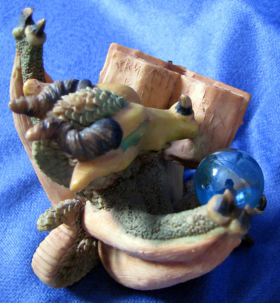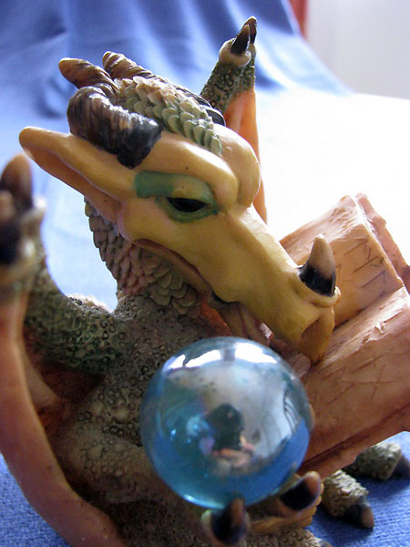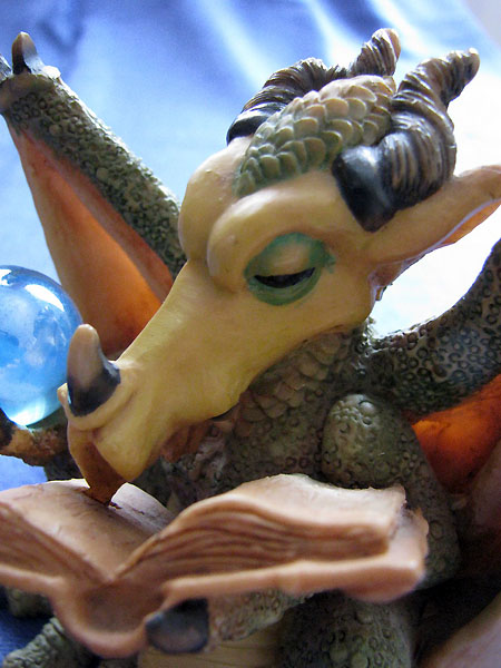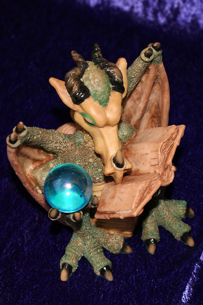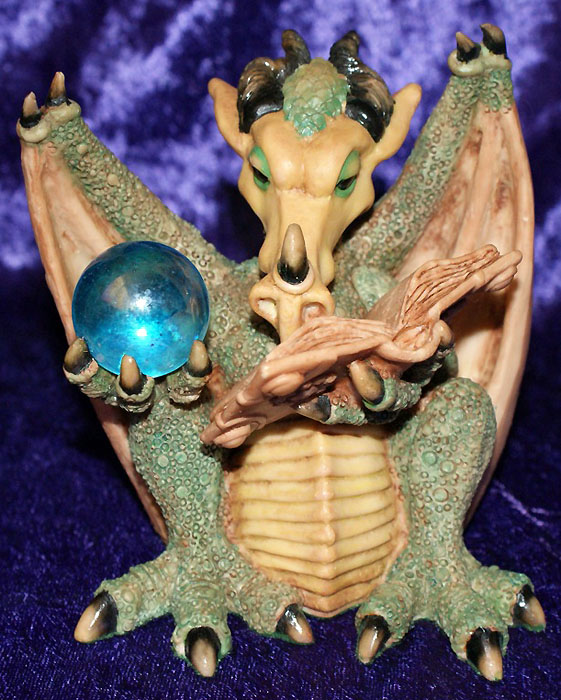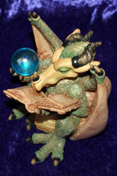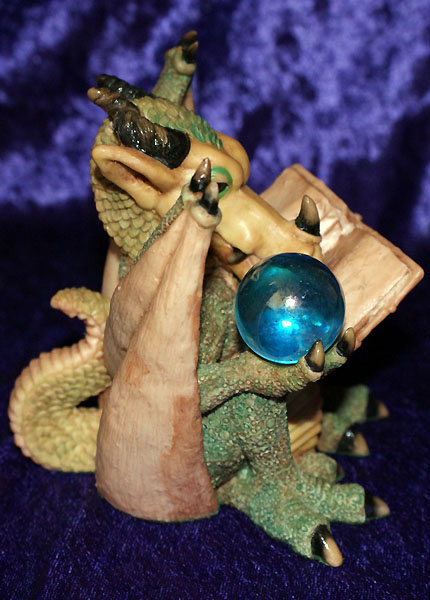 This rather young dragon, Fenwick by name, has just emerged from a carefree childhood and entered a period in his life in which he has begun to seek the knowledge of the ages. Many skills are required of a mature dragon, among which is the very important ability to foretell the future. Fenwick intently studies his book of crystal gazing as he teaches himself to become a fierce and powerful adult.