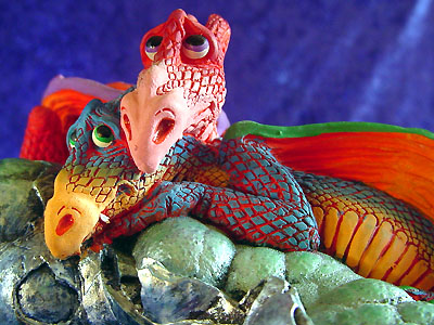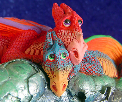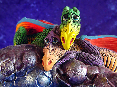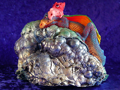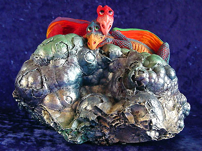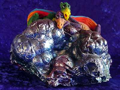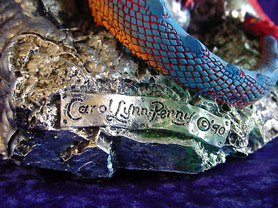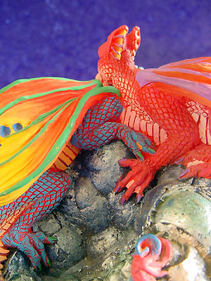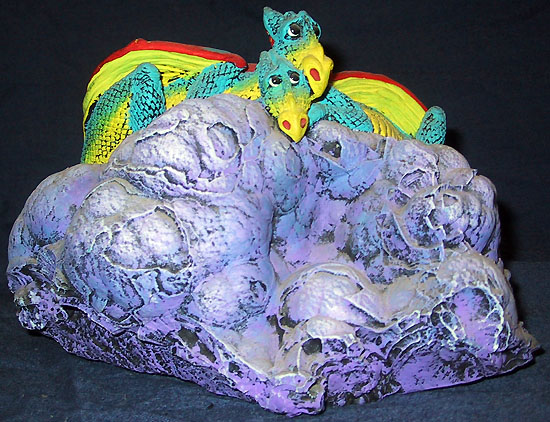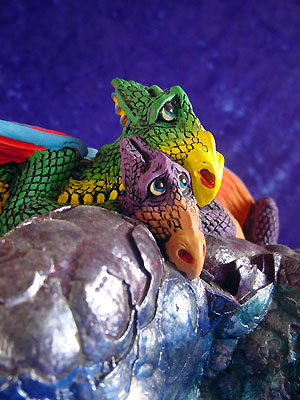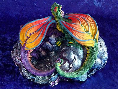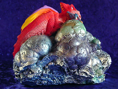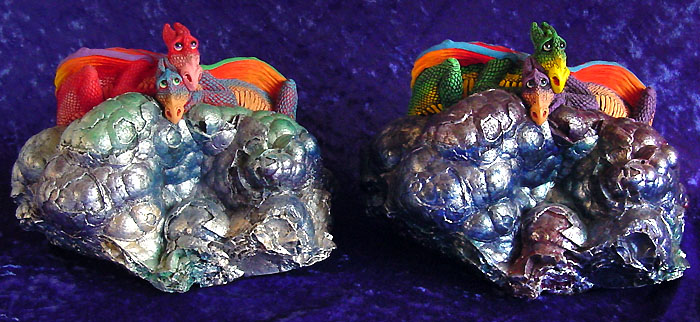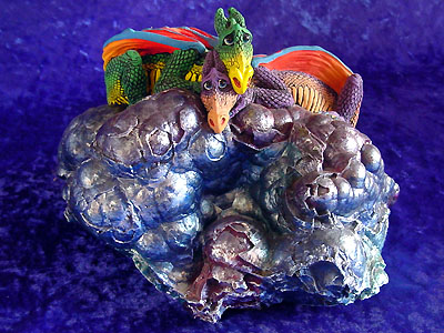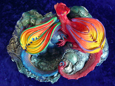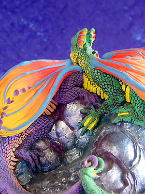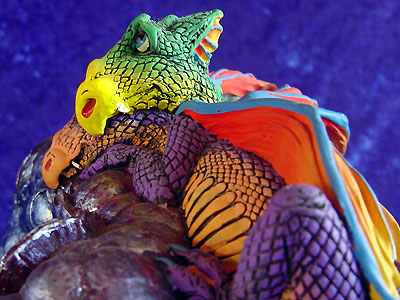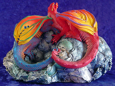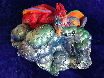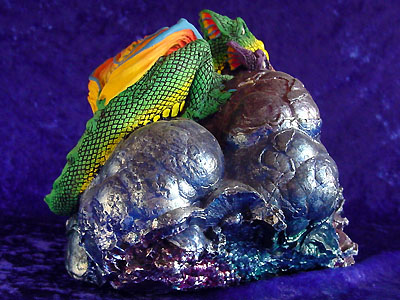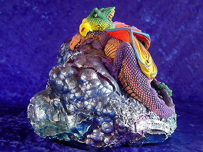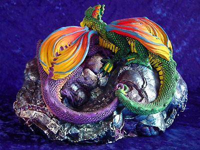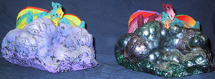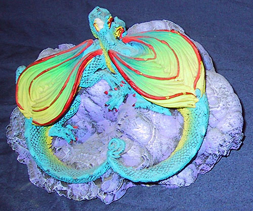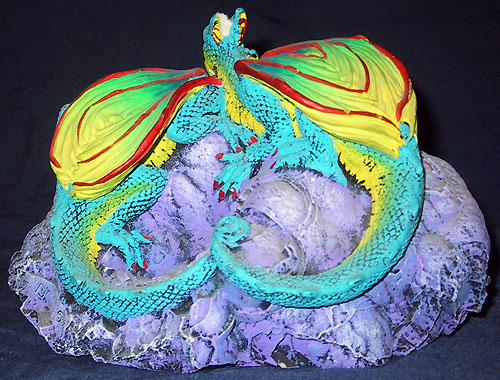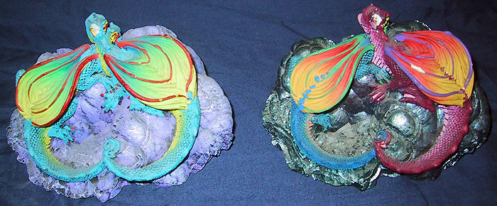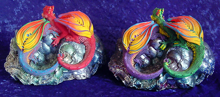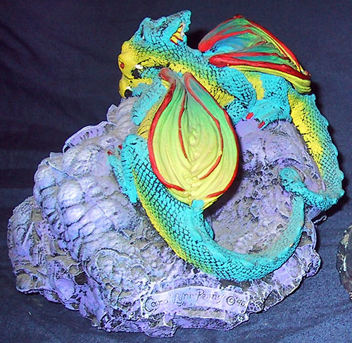 The dragons are blue and yellow and the base is black painted over with blue and purple matt paint instead of the gorgeous metallic colours used by Genesis before the sale