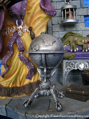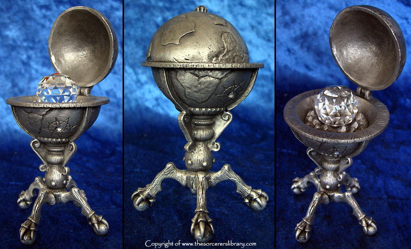 The globe at the front of the piece is made from metal and is seperate, it has a hinged top which opens to reveal a crystal |