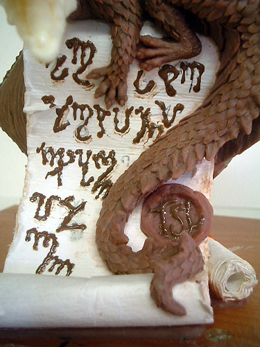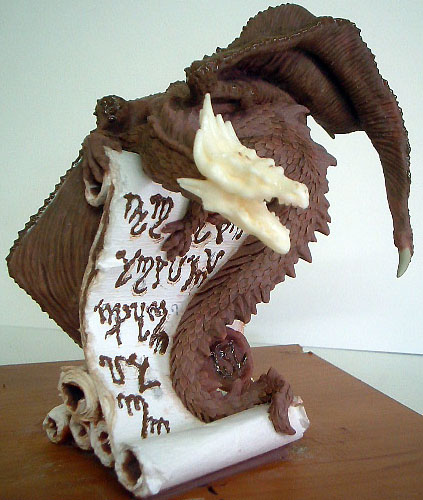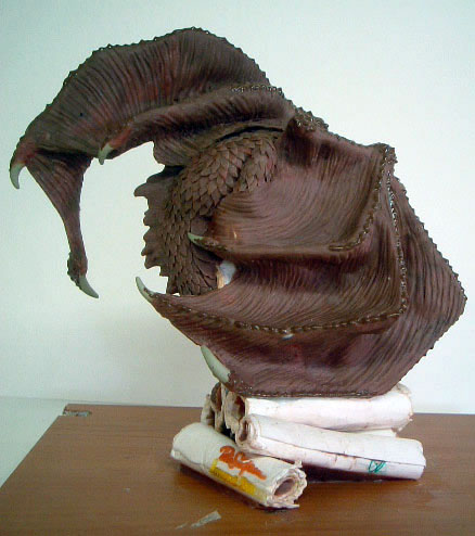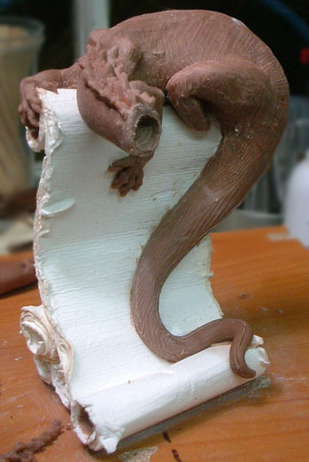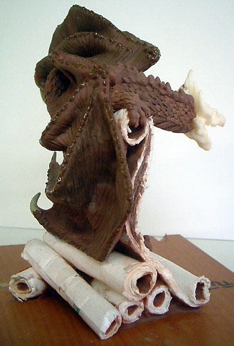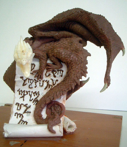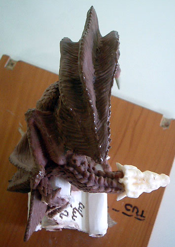 This is the wax at an early stage, the main body is together but it needs all the detail like scales adding and the wings have to be completed, at this point the head had already been sculpted and cast in a mould so that a more solid head could be used to test fit while sculpting the rest of the piece.
