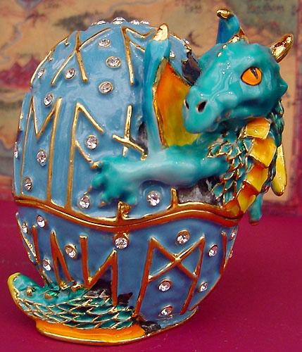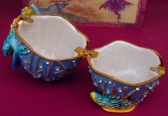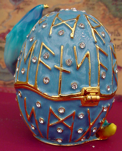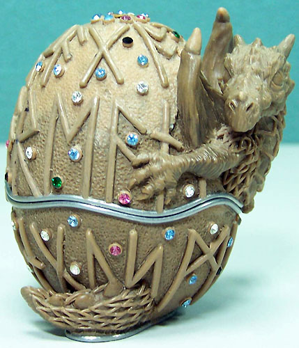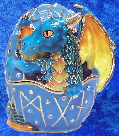 The eggs are little trinket boxes that open up, they are made from pewter with an enamel finish