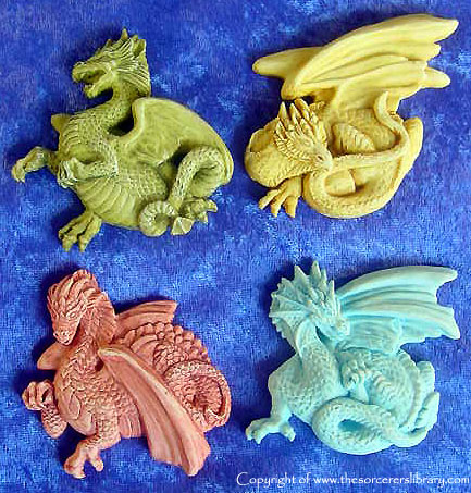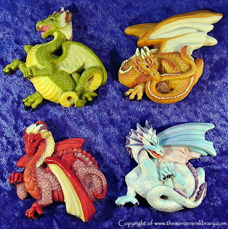 These were meant to be cameo's of the 4 season Dragons to be released one each year and to be given away on joining the club along with the regular free piece and they were supposed to be cast in pewter by an outside contracted company but no one was happy with the result so they cast it themselves in resin and painted it to look like metal but EN2113 Gorgoyle ended up being the only one given away, the other three turned up at the Extravaganza's as fridge magnets in various colours I picked ones that were close to the season colours but you could get them in rainbow colours amongst other things - I also managed to get hold of a set painted exactly like the season dragons which are very nice indeed, it would have been nice if they were all painted this way. Also notice that the pose of each piece is like the first edition season Dragon that they represent |