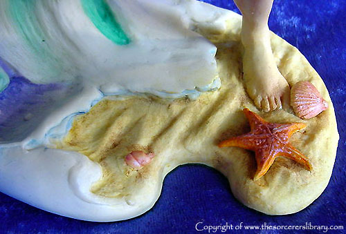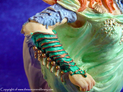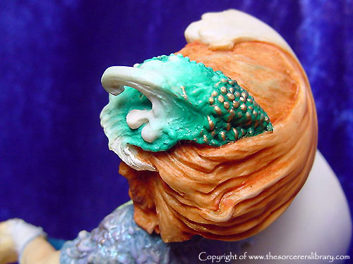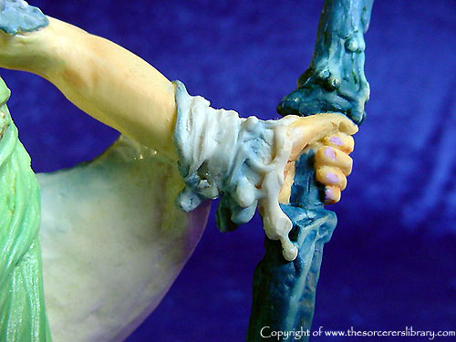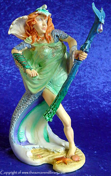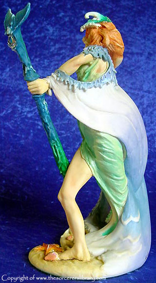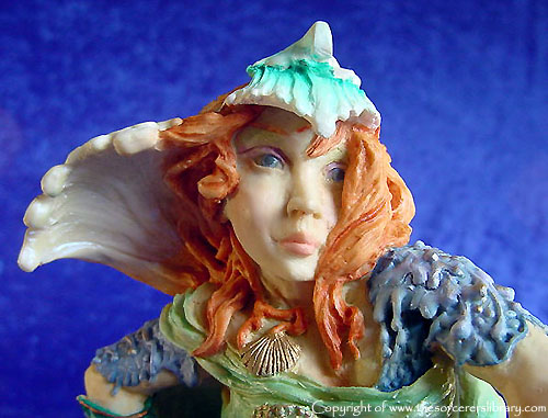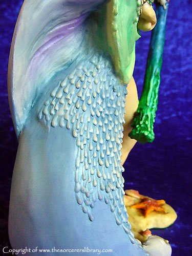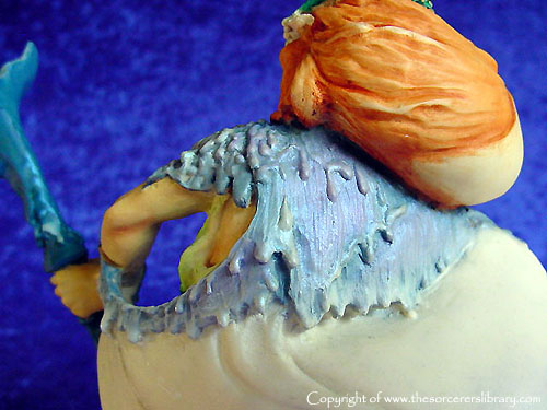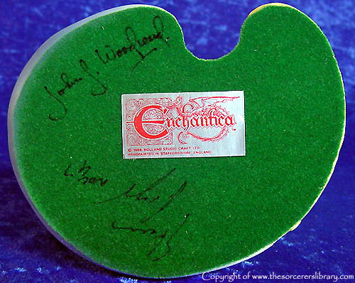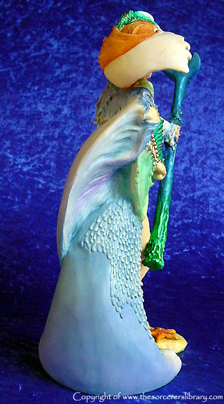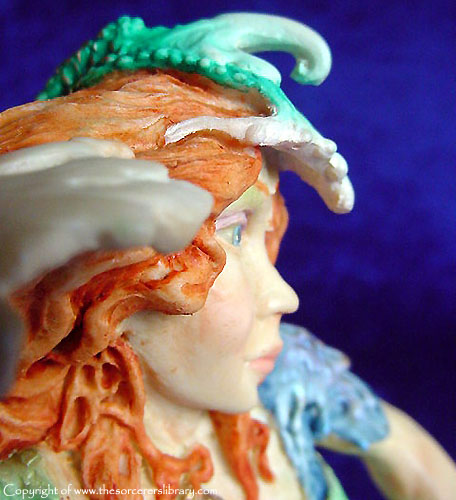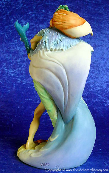 This piece has a different history depending on who you listen to so I will try to include all the versions here - she was made for a UK store (or catalogue company) but didn't sell well (or the shop / catalogue went bankrupt) and the remainder of the piece were shipped out to America. According to some she isn't a piece of Enchantica but she does come in a box with an HSC barcode and she has an Enchantica sticker on the base and is signed by sculptor John J. Woodward* and the artist and the latest info which came from Factory Manager Dennis Vyse just before he left the company in 2001 was that she wasn't meant to be a piece of Enchantica but she was sold in America as just that. No matter what the truth is behind this piece I have included it because it is still a piece of Enchantica / HSC history and as such it deserves to be included. It is in my mind the ugliest piece ever produced and does not fit in with the other pieces at all so I would go for the fact that it isn't realy Enchantica but the history is there to give it a link to the range *Another piece of interesting information is that the piece was always listed as a John J. Woodward Sculpture, this isn't true, it was sculpted by Tom Raine who at the time worked for rival company Collectable World Studios creating Land of Legend Figures with Hap Henriksen. It was decided by Doug Mitchell (Snr) who bought the remaining stock to sell in the U.S. to put Johns name to it (after he had left HSC!) because he was better known to Enchantica fans! This explains a lot because it looks a lot more like Toms sculpting style than Johns. |