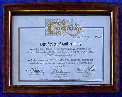 This piece came with the wooden framed certificate as shown below