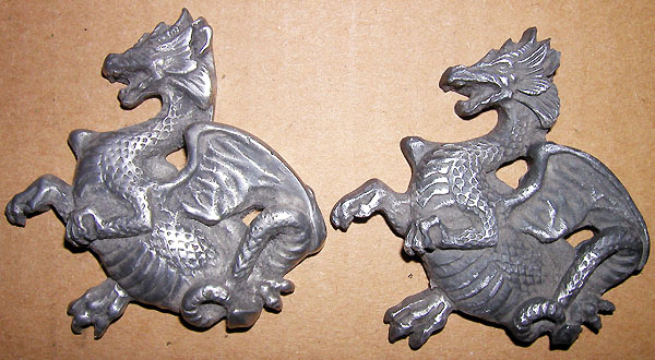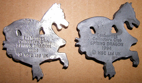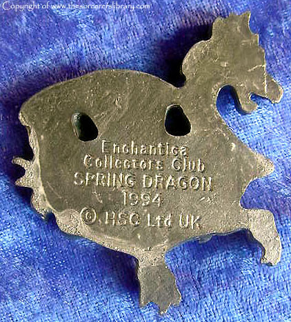 This was to be the first of 4 season Dragon cameo's to be released (one each year) and to be given away on joining the club (along with the regular free membership piece) and it was supposed to be cast in pewter by an outside contracted company but apparently no one was happy with the result (also probably due to cost) so they cast it themselves in resin and painted it to look like metal but this one ended up being the only one given away to club members, the other three pieces (which were sculpted at the same time) turned up at the Extravaganza's as fridge magnets instead in various colours. |