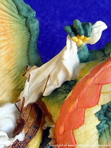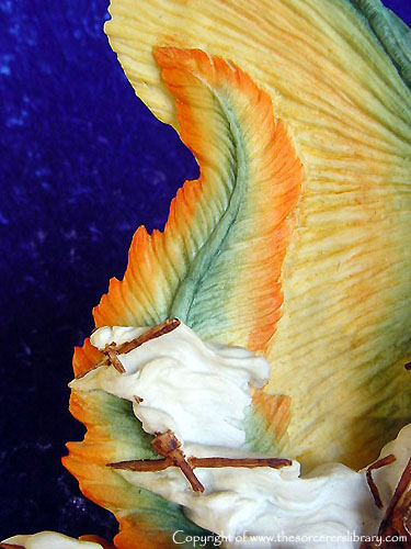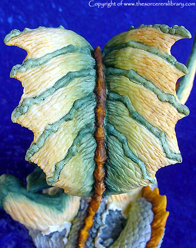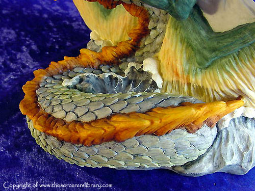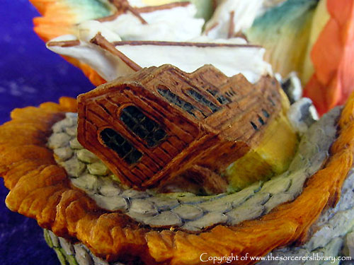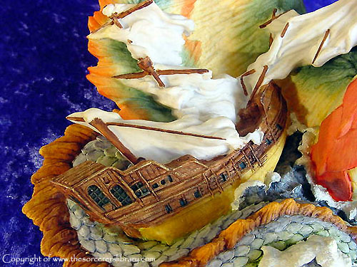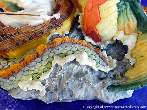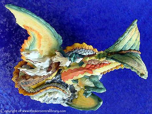 To traverse the approaches to the Wizards’ Island in safety, a friendly galleon must lower a special instrument, called a washwail or sea chime and drag it on a long rope below the wake of the ship. The passage of the finned pipe through the water, crafted in the form of a fish, creates a penetrating whine thus informing the vigilant leviathans on the ocean floor that the vessel above carries the Wizards’ favour. Any ship daring to near the sapphire surf of the island haven without the protection of a sea chime must suffer the fate of an enemy. For the mighty beasts, with long, serpentine bodies and vast fin wings that lurk in the giant kelp forests, will rise at the approach of a large ship and if the familiar moan of the washwail is not heard, break surface in a mountain of foam and scale and fall upon the doomed interloper.