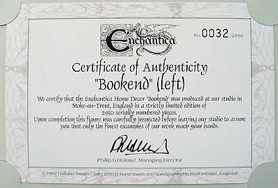 Originally this piece was to called 'TANATOR' and be in sepia colours (see picture on this page) also it was to be an open edition but things changed. Not a very popular item this judging the amount sold, and you have to admit that it is awful, a huge disappointment to me as I was really looking forward to a pair of bookends. They should have stuck with the sepia colours because I'm sure they would have sold more and they actually suited the figures. Should be sold as a pair with EN2218 - see picture below (strange to note that this sold one more than the right bookend) Part of a proposed 'Home Decor' Range that never took off |