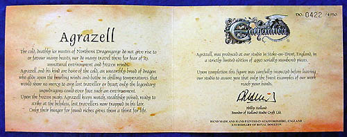 Agrazell and his kind are born of the cold, an unearthly breed of dragon who glide upon the howling winds and bathe in chilling temperatures that would show no mercy to any lost traveller or beast; only the legendary snowdragons could ever face such an environment.