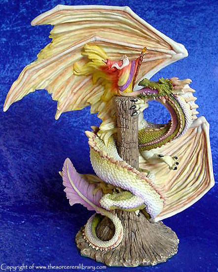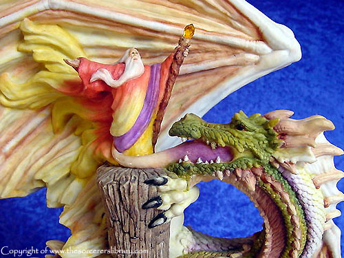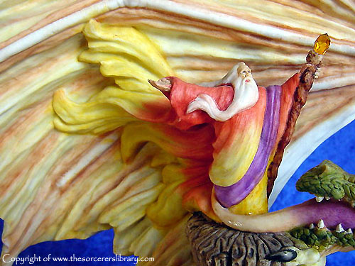 Rothgillian the Wizard on top of the pillar is better known as 'Throstle' and he appeared as part of the January 2002 releases as a figure on his own EN2365 Throstle (well almost, he will have his faithfull little dragon 'Addax' on his shoulder. He is also known as 'Horcust Rothgillian - Dragonmaster of Eyesand, Lord of Eddilee' and 'The High Wizard of Eddilee' but he prefers Throstle |