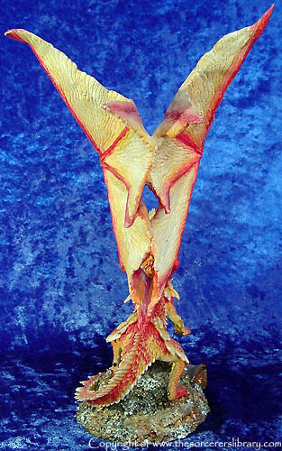 Rob Simpson was going to release this as one of his Dragonlore range but Xystos bought it and asked Rob to do a few alterations to it, this included changing the base from a mound of treasure to lava rock! Rob also added extra detail work to the dragon too. For some reason the name of the piece gained a letter "C" and an extra "K" at the end and lost an "A", as Rob called it Jurellaak! |