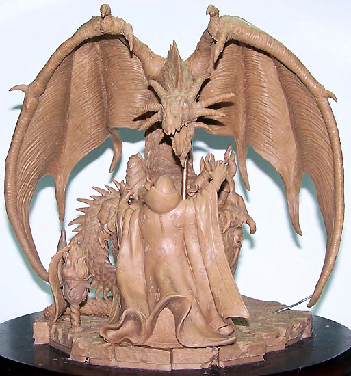 (The final sculpt with wing edges thinned, horns on head smoothed out to remove spiral patern and base on the lantern pedastal thinned)