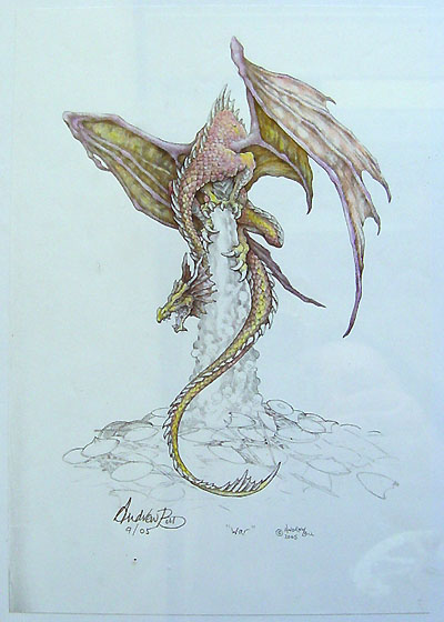 This was Andrews first concept for the "Anger" piece from the seven deadly sins range but Adrian wanted a fire breathing dragon so Andrew did a different dragon for "Anger" and he renamed this art "War"