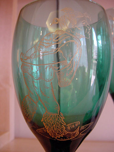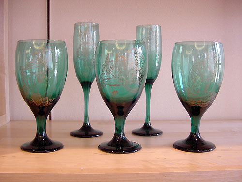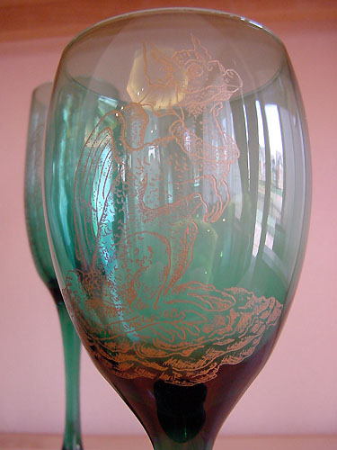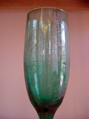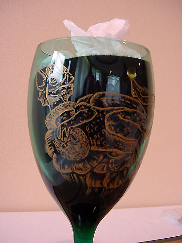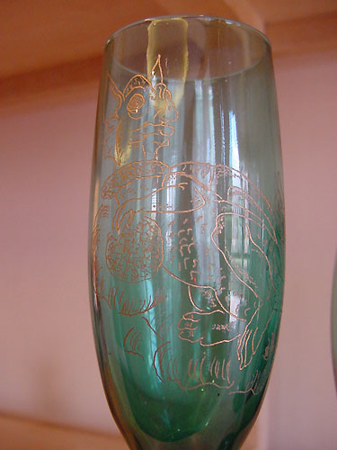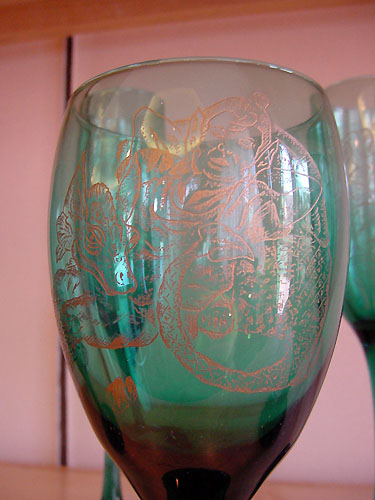 The glasses shown below were presented to Andrew Bill by an American glass artist and feature Ratterjack and Jonquil (5 glasseswere displayed at the aucion but there were actually 6 glasses).