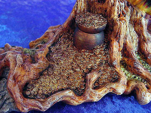 The fairy forest dwellers were generous in the amount of gold they placed at the end of their rainbows but they exacted a heavy toll: a dragon! Craftily concealed by enchantment, the ferocious beast would lie in wait for unsuspecting pilferers and then spring a terrifying ambush. Needless to say very few fairy coins ever found their way into general circulation!